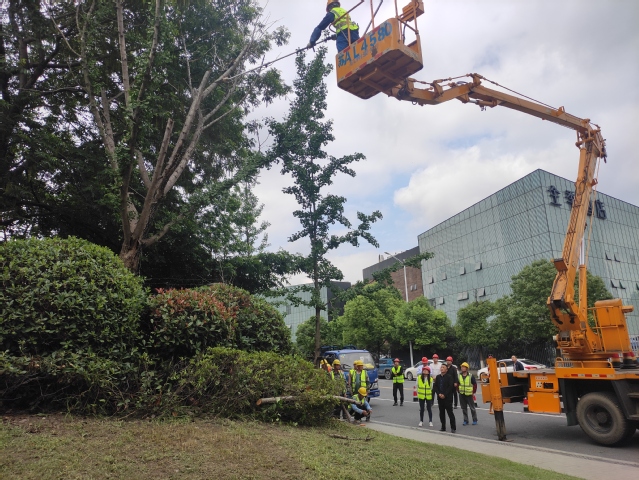 與此同時,另一條指令隨即傳出,“河西大街樹木枯枝斷枝,存在極大安全隱患,立刻到場處置”。公司立即調(diào)配3輛園林搶險車輛、1輛高架車,20名搶險隊員第一時間趕到現(xiàn)場。指揮勘查險情、實施圍擋、引導(dǎo)交通、處理險枝,大家分工明確、操作熟練,搶險過程一氣呵成。20分鐘后,這株干徑超過40厘米、高10米的大樹上的枯枝已全部修剪到位,解除了安全隱患。