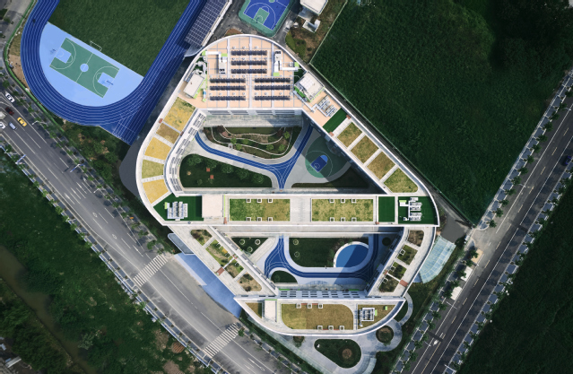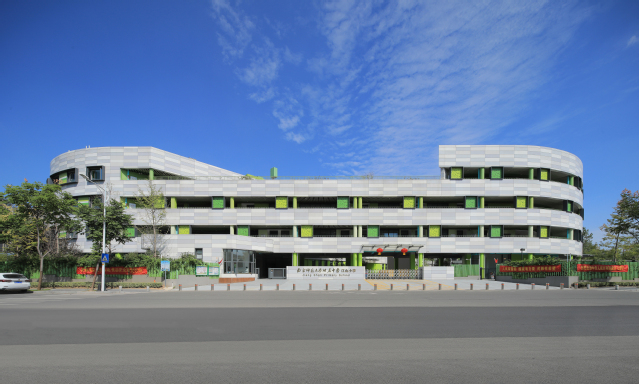 河西新城四小位于南京市建鄴區(qū)江山大街以北、黃山路以東,建筑面積2.79萬(wàn)平方米,教學(xué)樓主體4層,局部3層,地下1層,建筑高度16.95米,可容納教職工和學(xué)生1705人。建筑整體采用扁平化字形結(jié)構(gòu),包含傳道授業(yè)的教學(xué)理念,造型可演化為鉛筆、書(shū)籍、綠葉,寓意在學(xué)習(xí)中獲得知識(shí)、不斷成長(zhǎng)。