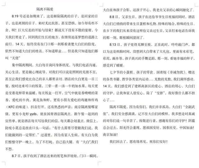 集中醫(yī)學(xué)觀察即將結(jié)束前,酒店工作人員收到了一份飽含深情的離別“禮物”。這是一封來自剛剛結(jié)束觀察生活、離開酒店順利歸家的市民朋友的感謝信,他用樸實(shí)真摯的語言回顧了與家人在酒店里生活的點(diǎn)點(diǎn)滴滴,表達(dá)了對(duì)集中觀察點(diǎn)指揮部、各工作組及國(guó)青酒店的感謝與祝福。