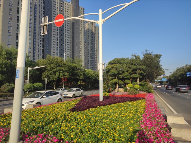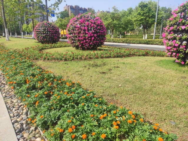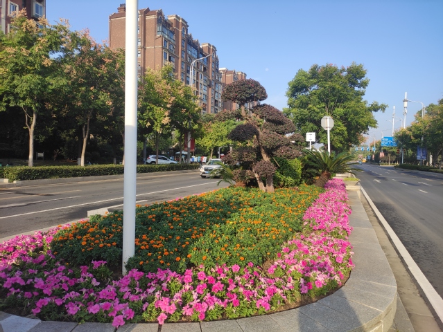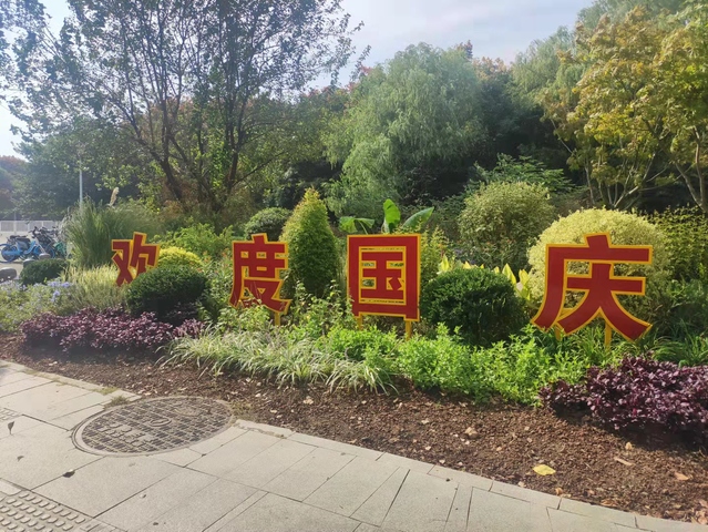 樂山路和夢(mèng)都大街的東南角節(jié)點(diǎn)是新增加的花境景觀,使用了完美冬青、迷迭香、金葉蕕等二十多個(gè)草花品種,錯(cuò)落有致的草花搭配和花境中豎起的“歡度國(guó)慶”標(biāo)語牌,烘托出熱烈的節(jié)日氣氛。