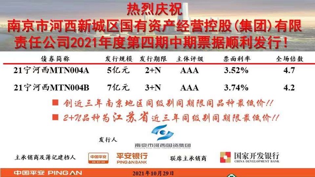 111日,集團(tuán)2021年度第四期永續(xù)中票順利發(fā)行,發(fā)行金額12億元,期限3+N年品種7億元,票面利率3.74%;期限2+N年品種5億元,票面利率3.52%,均取得南京市近三年同級(jí)別同品種最低價(jià)格!