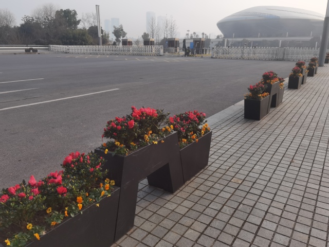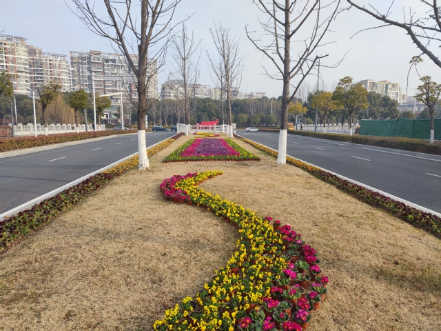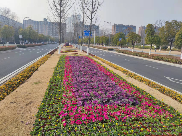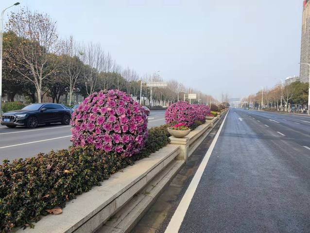 江蘇大劇院水韻路中分帶的花球也換上了“新裝”。10個巨大的羽衣甘藍花球被粉色的報春花和紅黃顏色角堇組成的花帶簇擁著,與兩邊的直線橙色花邊、方形花卉矩陣、流線型花帶一起構成了一幅色彩斑斕、氣勢恢宏的絢麗畫卷,不但為兩會烘托出莊嚴隆重的氛圍,也洋溢著春節(jié)喜慶的氣氛。