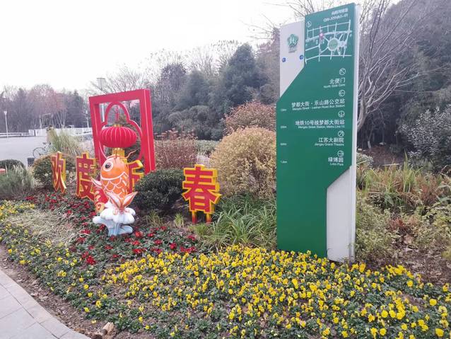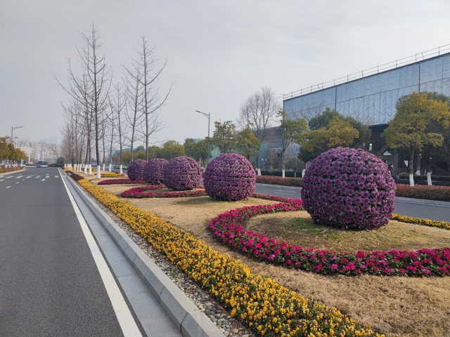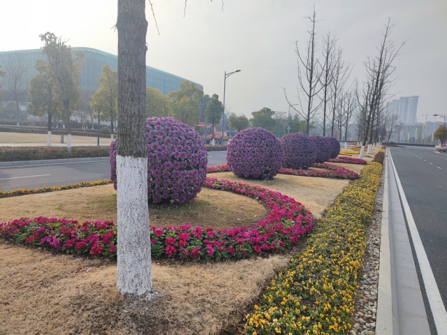 南京奧體中心北門夢都大街人行道旁新增設一組 “歡度新春”花境式小品生態(tài)微景觀,深紫色羽衣甘藍與黃色三色堇植物的搭配,簡潔明了,“鯉魚躍龍門”小品和“歡度新春”字樣的組合營造出濃濃的年味。道路中分帶的花球換上了“新裝”,4個巨大的羽衣甘藍花球在太陽下盡情地綻放著,烘托出了冬奧會的隆重氣氛,寓意在歡度新春佳節(jié)之際,祝愿冬奧會的奧運健兒們能夠魚躍龍門創(chuàng)佳績。