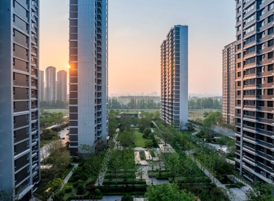 小區(qū)以1300平方米的陽光草坪為核心,烏桕林、櫻花林與低矮灌木穿插其間,形成“花葉共賞、四季生機”的浪漫花廊;烏桕林與水景水系則構(gòu)成“水榭林間”中央景觀軸,融入生態(tài)草坪設計,增強了居民與自然的互動體驗。